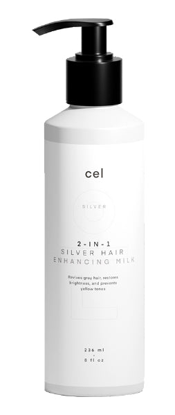 Cel’s hydrating Silver Hair Enhancing Milk is designed to act as both a shampoo and a conditioner, to revive gray hair, restore brightness, and prevent yellow tones that are caused by the sun and other environmental stressors.